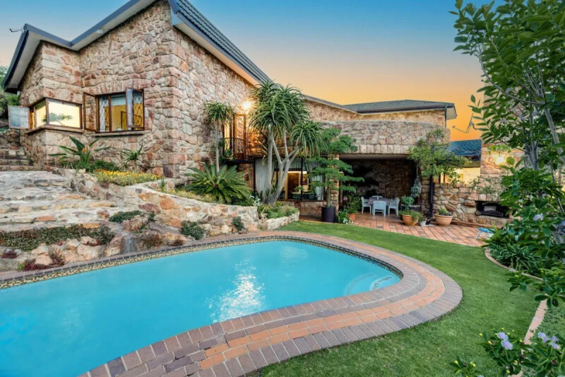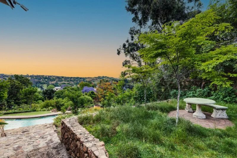 Spacious reception areas with extraordinary windows and views. Northern and southern views complement rare sunsets. Indoor / outdoor entertaining to covered patio and outside wood burning fireplace. 3 Double beds, main en-suite, family bathroom and guest cloakroom. Fully equipped dine-in kitchen. Pyjama lounge/ 4th bedroom / library / study or office studio complete with rooftop garden patio 360 views. A matching fully self-contained stone cottage, private and tranquil, comprises kitchenette, shower room, bedroom lead to private patio and pond. All set on 5172m² of indigenous, adventurous garden including swimming pool. Previous borehole could be reinstated. Perfect for camping, climbing reinstate flat lawn for sport activities with ease. An inimitable outdoor Boma in a grove of trees with Urban views is the perfect setting for a firepit and braai evening supreme.