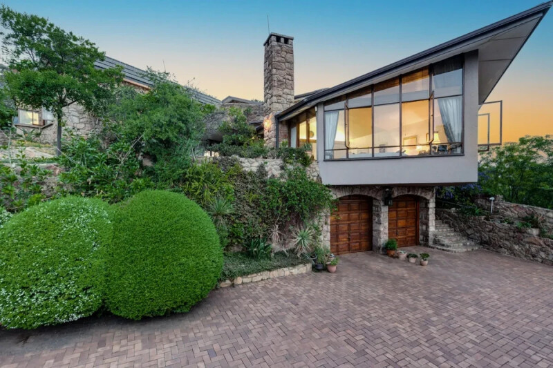 Location location location. Listen to the wind blow. See the sunsets across the African sky. Smell the natural flora on the unspoilt landscape of natural terrain. 360 Views include the Magaliesberg and Urban views that will seduce and excite. An all night cinematic experience awaits. Come and see for yourself. The house invokes local elements with use of stone, wood and glass. Spacious high ceiling rooms and large windows bring warmth and light. 3 Wood burning fireplaces interior and exterior The piece de resistance is a cantilevered lounge that hangs suspended over the driveway, as stairs either side rise to the entrance doors.