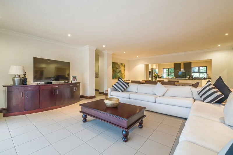 The spacious formal lounge, with sliding doors open onto an underroof entertainment area with spectacular views of the Magalies mountain range.