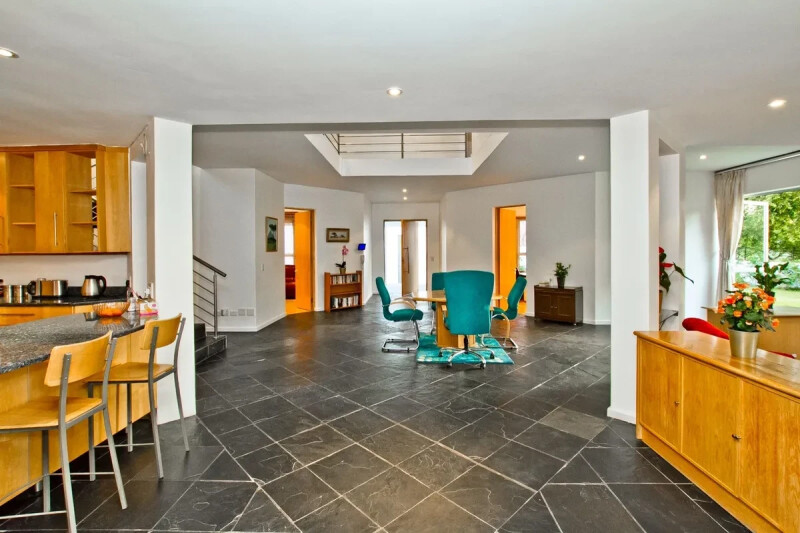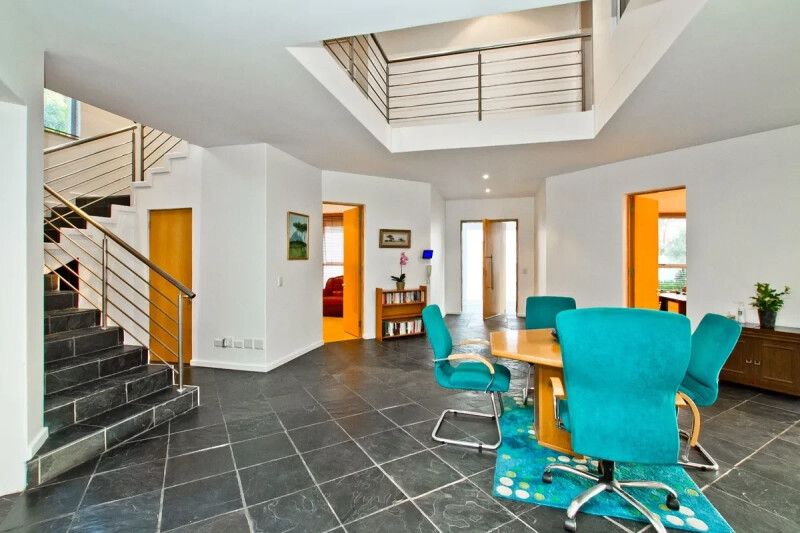 Up the stairs to the landing leading to three bedrooms and two bathrooms with an incredibly large separate 4th bedroom wing consisting of lounge, bedroom with shower room, kitchen opening onto a private balcony overlooking the valley. This suite has a private entrance from down stairs should you wish to accommodate parents or as a large studio/office suite as it is also linked to the house. The home is well fitted with wooden cupboards. There is open plan living with very good private spaces where families can enjoy a get away from it all. Asking R8 million. Serious sellers have bought elsewhere taking all reasonable offers.